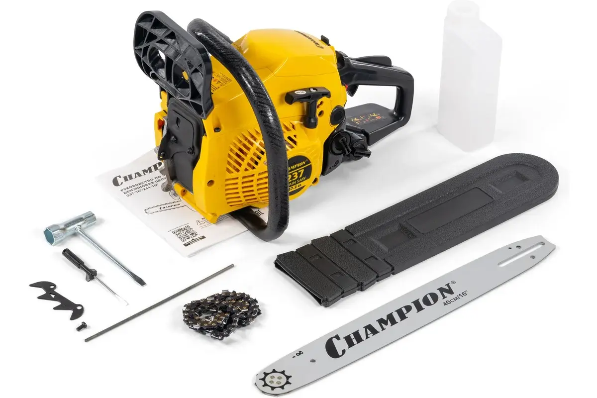 Бензопила CHAMPION 237-16 используется при валке деревьев, обрезке ветвей, распиливания заготовок из древесины.