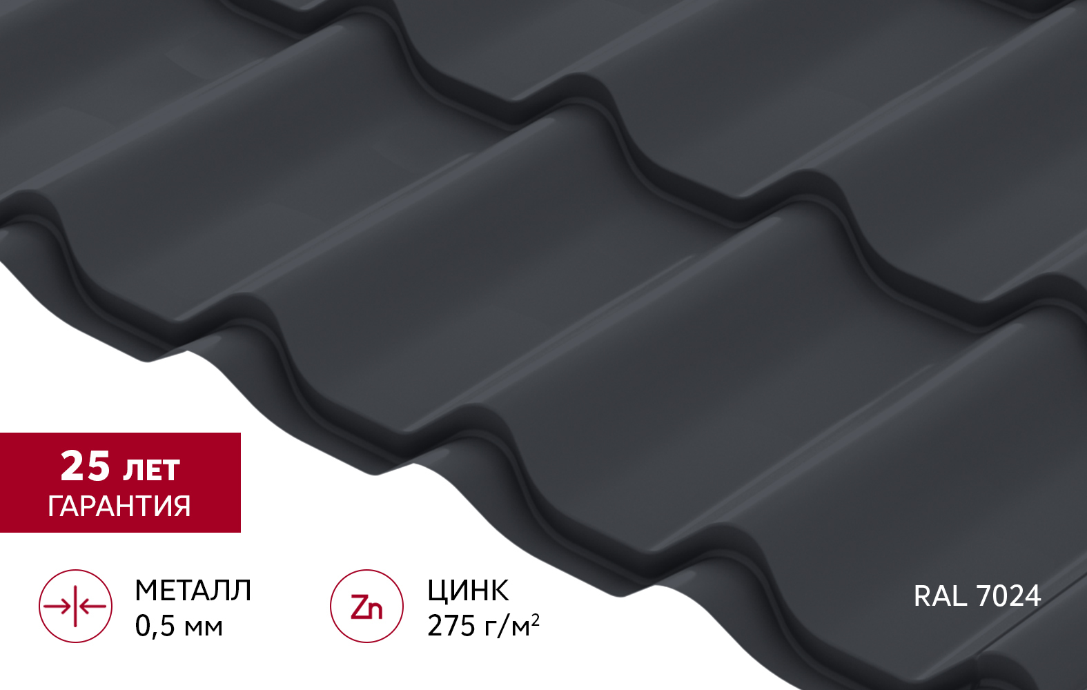 Металлочерепица Классик ("Classic") v01 0,5 Atlas X RAL 7024 мокрый асфальт